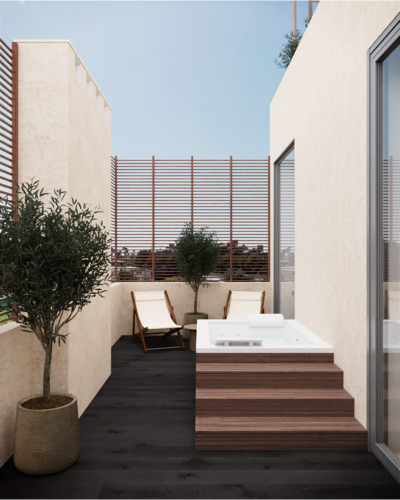 Les espaces généreux en extérieur et les terrasses s’intègrent comme des extensions du salon, grâce aux fenêtres allant du sol au plafond qui inondent l’intérieur de lumière naturelle. C’est l’idéal pour profiter du beau temps toute l’année.